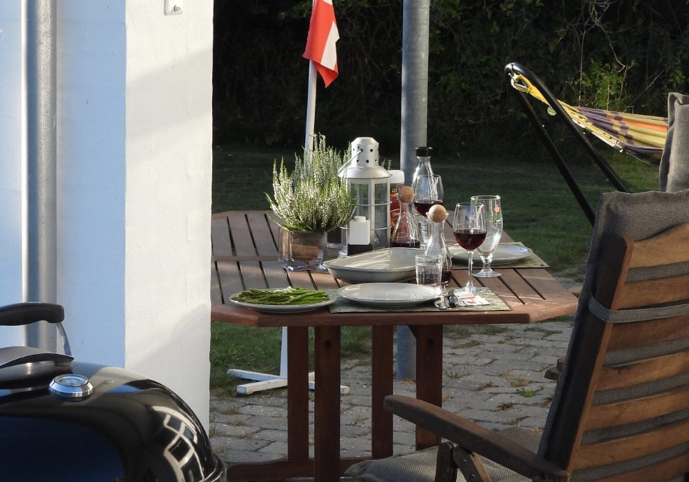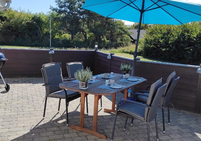 Die sonnige und möblierte Terrasse des Ferienhauses in Süd-/Südwestlage bietet sowohl einen offenen als auch einen überdachten Bereich. Ein Kugelgrill steht für ein gemütliches Barbecue bereit.