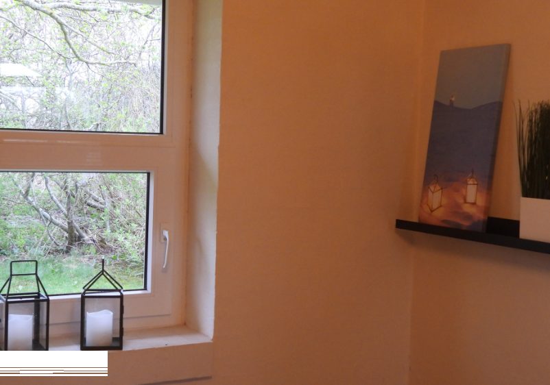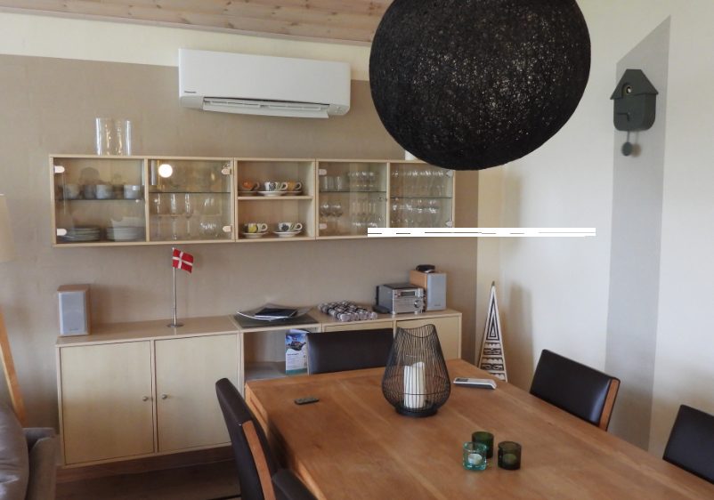 Die Ferienunterkunft ist mit einer Luft-Luft-Wärmepumpe ausgestattet, mit der der Wohnbereich beheizt und auch gekühlt werden kann. Zusätzlich befinden sich in den Zimmern Elektroradiatoren. Bad und WC haben außerdem eine Fußbodenheizung. Ein Kaminofen verleiht dem Wohnbereich auch in kälteren Jahreszeiten eine behagliche Wärme.