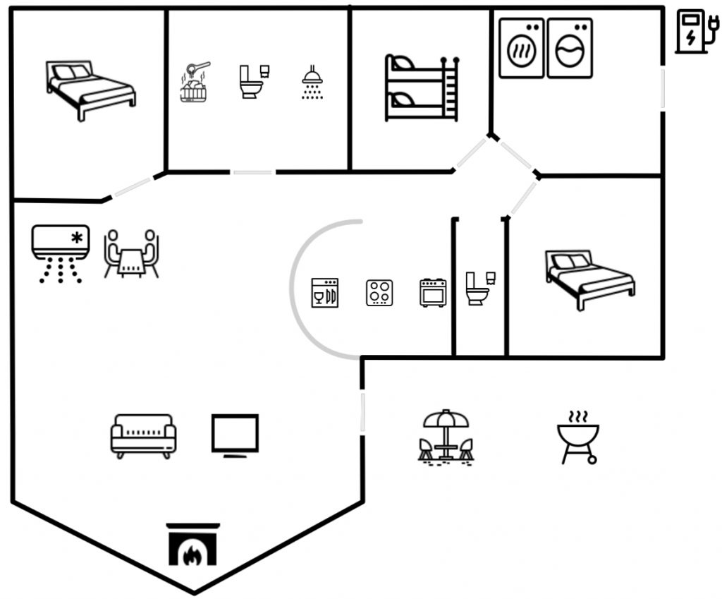 Die Ferienunterkunft ist mit einer Luft-Luft-Wärmepumpe ausgestattet, die das Haus bei Bedarf zuverlässig und energiesparend beheizt. Zusätzlich befinden sich in den Zimmern Elektroradiatoren. Bad und WC haben außerdem eine Fußbodenheizung. Ein Kaminofen verleiht dem Wohnbereich auch in kälteren Jahreszeiten eine behagliche Wärme.