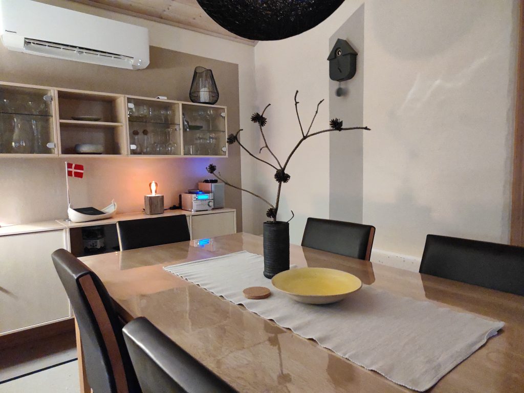 Der Wohnbereich kann durch eine Klimaanlage/Wärempumpe bequem über eine Fernbedienung beheizt oder gekühlt werden. Der Kaminofen sorgt an kühleren Abenden für behagliche Wärme im Wohnraum. Genießen Sie den Blick ins Kaminfeuer, während Sie es sich auf der Couch gemütlich gemacht haben.